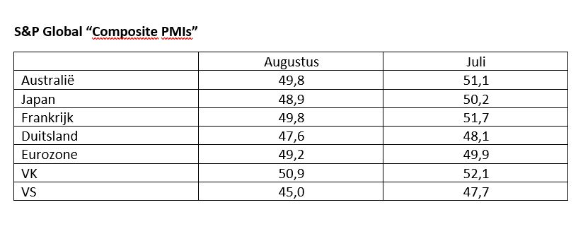 Deze week werden voor een beperkt aantal landen de voorlopige resultaten gepubliceerd van de maandelijkse enquêtes die S&P Global houdt naar het ondernemersvertrouwen. In de tabel heb ik de cijfers opgenomen voor de samengestelde index, dat wil zeggen die voor de industrie en die voor de dienstensector gecombineerd. Wat natuurlijk opvalt, is dat het vertrouwen in alle landen is gedaald in augustus en in alle landen, behalve het VK, onder de 50 ligt. Als vuistregel wordt gehanteerd dat waardes boven 50 duiden op economische groei, waardes onder 50 op krimp. De ervaring leert echter dat deze cijfers behoorlijk onder 50 moeten liggen voordat echt van een recessie sprake is. Het beeld is desondanks niet fraai.