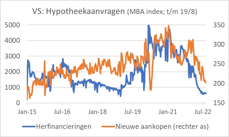 Ik ben bang dat het er nog even niet beter op wordt in deze weekly. De rente is in de VS dit jaar al behoorlijk gestegen. De Fed heeft de rente vier keer verhoogd met 2,25% in totaal en ook de kapitaalmarktrente is behoorlijk gestegen. Hoewel de kapitaalmarktrente nog altijd laag is in historisch perspectief, heeft die rentestijging wel al heel zichtbare gevolgen voor rentegevoelige sectoren. De volgende grafiek laat het aantal hypotheekaanvragen zien, uitgesplitst naar aanvragen voor herfinanciering en aanvragen voor de feitelijke aankoop van een woning. De lage stand van het aantal aanvragen voor woningaankopen bevestigt dat de huizenmarkt momenteel snel afkoelt. De zeer lage stand van het aantal aanvragen voor herfinancieringen betekent dat gezinnen steeds minder in staat zijn hun cashflow te verbeteren door hun hypotheek over te sluiten. Daarmee valt een belangrijke bron weg waardoor consumenten hun bestedingen op peil konden houden ondanks de uitholling van hun koopkracht. Dit is dus geen goed teken voor de ontwikkeling van de consumptieve bestedingen in de komende kwartalen.