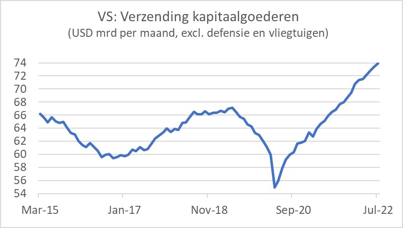 Ondanks alle sores blijft het Amerikaanse bedrijfsleven gretig investeren. Ik richt mij daarvoor altijd op het maandelijkse rapport over de orders voor duurzame goederen. In het bijzonder volg ik de reeks die de verzending van kapitaalgoederen (exclusief defensie en vliegtuigen) weergeeft. Die reeks is een goede proxy voor investeringen van bedrijven. Zoals het volgende plaatje laat zien, blijft het dollarbedrag stijgen. Momenteel ligt de waarde van de verzonden kapitaalgoederen ruim 11% hoger dan een jaar geleden. Daarmee geef ik overigens wel direct de makke van deze reeks aan: het gaat om nominale bedragen. Jarenlang stegen kapitaalgoederen niet of nauwelijks in prijs, maar in de huidige inflatiechaos is dat veranderd. Ik kan niet precies inschatten hoeveel van de stijging van 11% een prijseffect is en hoeveel een volumestijging.