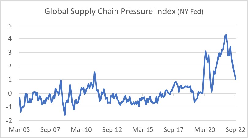 De 'echo' van de pandemie heeft positieve, negatieve en verrassende invloeden op de conjunctuur. Het belangrijkste positieve is natuurlijk dat de samenleving weer open is, zij het dat China nog steeds wordt geteisterd door plaatselijke lockdowns. Wel helder is dat de logistieke verstoringen in de wereld snel afnemen, zie bijvoorbeeld de Global Supply Chain Pressure Index van de New York Fed.