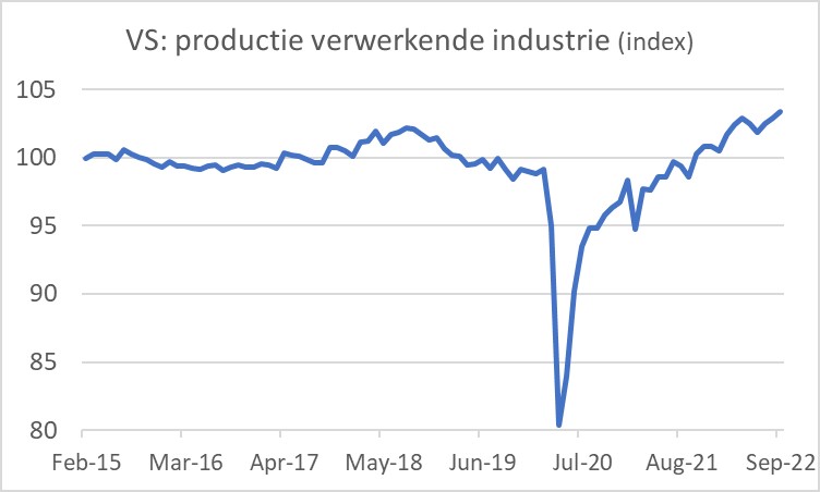 Anderzijds lijkt de Amerikaanse industrie zich er niets van aan te trekken. In september steeg de productie in de verwerkende industrie met 0,4% maand-op-maand en 4,8% jaar-op-jaar. Het volgende plaatje laat de index zien van de productie in de verwerkende industrie in de VS. Ik vind het een opmerkelijk plaatje. In de periode 2015 tot 2019 zat er weinig dynamiek in de sector. Sterker nog, er was niet of nauwelijks sprake van enige groei. Uiteraard daalde de productie sterk in de pandemie, maar inmiddels heeft zich een heel opmerkelijk herstel voorgedaan, is het productieniveau van voor de pandemie overschreden en zet deze groei zich vooralsnog onverdroten door. Zou het iets te maken kunnen hebben met 're-shoring', het terughalen van productie-activiteiten uit het buitenland naar de VS?