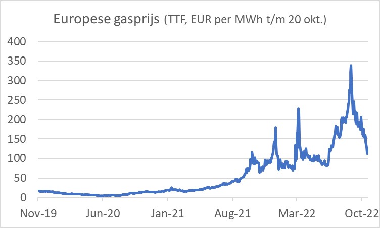 Ondertussen blijft de gasprijs mij voor verrassingen plaatsen. Het lijkt er nu sterk op dat het opbouwen van voorraden in Europa tot eind augustus heeft bijgedragen aan de fenomenale prijsstijging van toen. Inmiddels zijn de voorraden zo goed als geheel gevuld en de prijs op het moment van schrijven is zo'n 65% lager dan de piek tegen het einde van augustus.