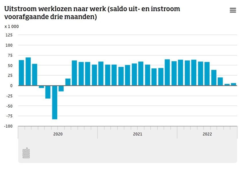De werkloosheid in ons land is in september stabiel gebleven: 3,8%. De arbeidsmarkt blijft onverkort krap. Toch was sprake van een lichte verslechtering van de omstandigheden op de arbeidsmarkt. Het aantal werklozen groeide de afgelopen drie maanden gemiddeld met 14.000. De laatste grafiek laat zien dat het aantal mensen dat vanuit een situatie van werkloosheid een baan vindt afneemt.