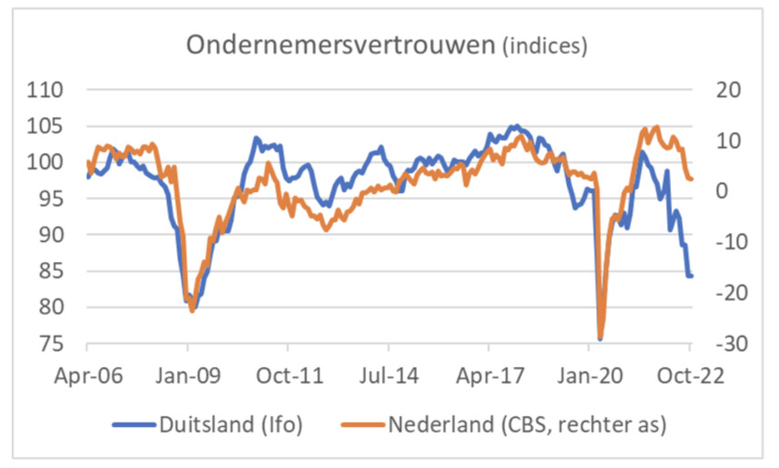 Ik merk verder op dat ons BBP in het tweede kwartaal extreem sterk was gegroeid: 2,6% ten opzichte van het voorgaande kwartaal. Dat kwam mede door incidentele investeringen in vaste activa die waarschijnlijk niet zijn herhaald in het derde kwartaal. Wanneer het CBS op 15 november de eerste schatting van de economische groei publiceert, komt er volgens mij een negatief cijfer uit de bus. Toch is het beeld beslist niet negatief over de hele breedte. Zo is het ondernemersvertrouwen in de industrie volgens het CBS in oktober weliswaar een heel klein beetje verzwakt: 2,5 tegen 2,6 in september. Deze vertrouwensindex ligt nog altijd boven het langjarig gemiddelde. Ik vind dat best opmerkelijk. De eerste grafiek laat zien dat het ondernemersvertrouwen bij ons (tenminste, op deze maatstaf) positief afsteekt tegen bijvoorbeeld het vertrouwen van Duitse ondernemers. Hoewel ik geneigd ben het CBS-cijfer wat te wantrouwen, moet ik erkennen dat het verschil met Duitsland spoort met het verschil wat betreft de productie in de verwerkende industrie. Die is bij ons ook veel sterker dan de Duitse. Dus ik moet niet de fout maken te beweren dat het cijfer niet klopt.