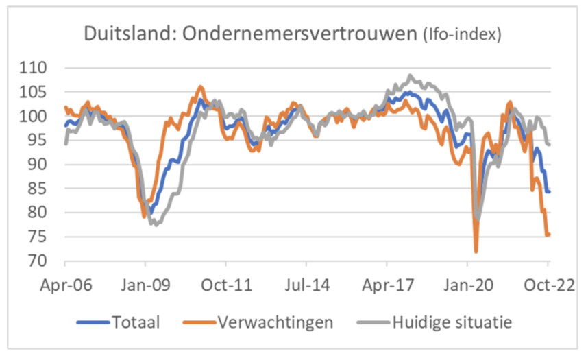 Overigens laat het volgende plaatje zien dat de verwachtingen-component van de Duitse Ifo-index op een wel heel erg laag niveau is beland, duidelijk lager dan ten tijde van de 'Great Financial Crisis' in 2008/09. De inschatting van de 'huidige situatie' is daarentegen een stuk positiever.