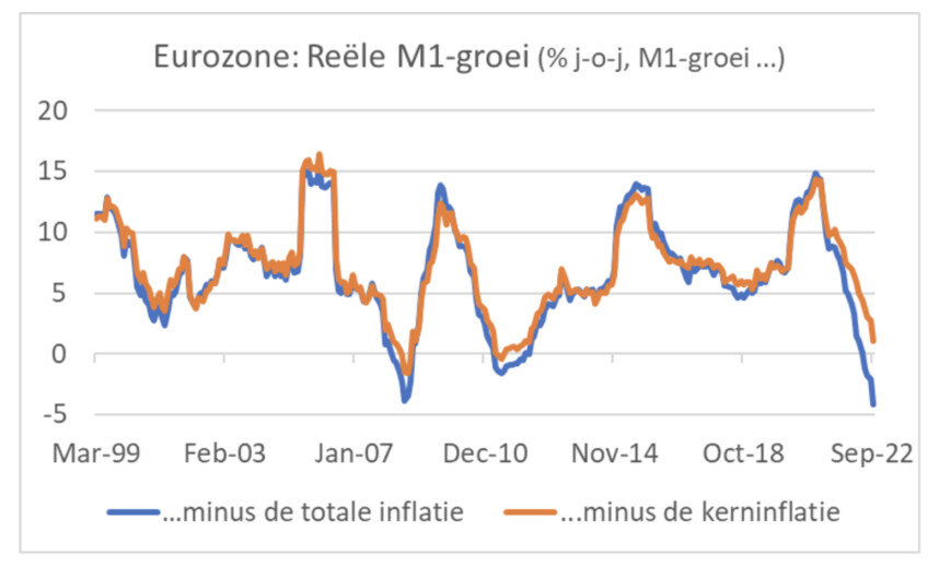 Het is tegenwoordig niet meer zo in de mode om naar de geldgroei te kijken. Vanwege mijn opvoeding als econoom doe ik dat stiekem toch. In september is de groei van M3 (kort samengevat: deposito's met een korte looptijd tot max twee jaar) in de eurozone weer iets versneld: 6,3% na 6,1% in augustus. De groei van M1 (munten en papiergeld in circulatie) vertraagde juist van 7,0% in augustus tot 5,8%. Voor de duiding van de conjunctuur op de korte termijn is de ontwikkeling van M1 relevanter dan die van M3. De groei van M1 is nu al twaalf maanden op rij gedaald. Veel economen kijken naar de M1-groei in reële termen, dus na aftrek van de inflatie. Het volgende plaatje laat dat beeld zien waarbij twee lijnen zijn weergegeven. In het ene geval is de totale inflatie van de M1-geldgroei afgetrokken, in het andere de kerninflatie. De boodschap is echter volstrekt duidelijk. De huidige reële geldgroei is vergelijkbaar met die van eerdere recessies.
