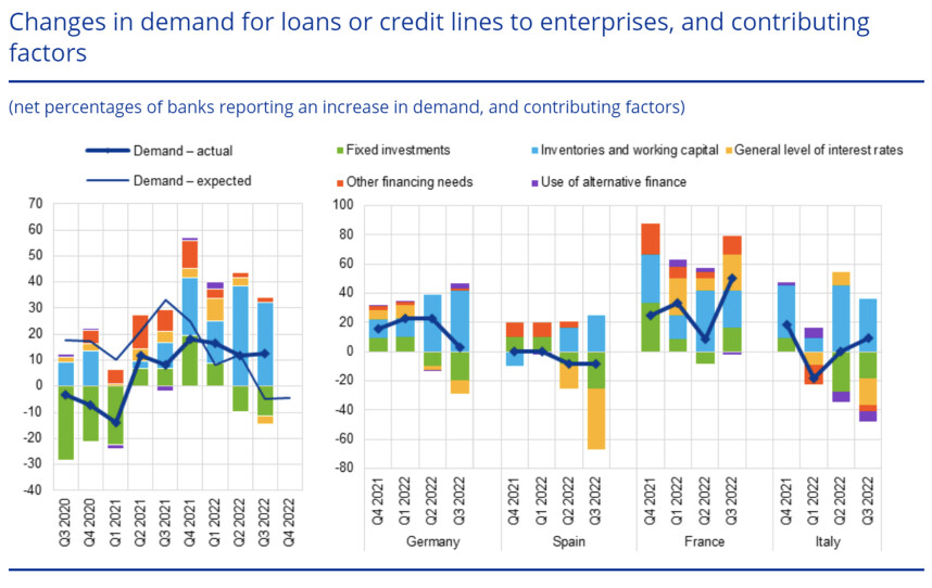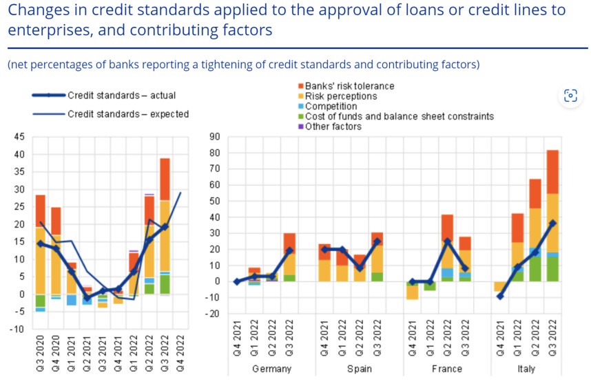 Als ik de ECB was, had ik de rente veel eerder verhoogd en had ik nu juist maar even pas op de plaats gemaakt om te zien hoe de economie en de inflatie zich verder ontwikkelen. Maar ja, ik ben de ECB niet. Mijn taak hier is niet te vertellen wat ze hadden moeten doen, maar wat ze gaan doen. Welnu, ik denk dat de ECB de rente in december nog een keer verhoogt met 0,5%. En daarna misschien nog een keer, met 0,25% of 0,5%. Maar dan is het wel klaar. Elk kwartaal enquêteert de ECB een grote groep commerciële banken over de kredietvoorwaarden, de vraag naar krediet, etc. De resultaten van deze 'bank lending survey' werden eerder deze week gepubliceerd. Ik vind het een belangrijke enquête, omdat een aanscherping van kredietvoorwaarden in het verleden vaak een voorbode is geweest van conjuncturele zwakte.