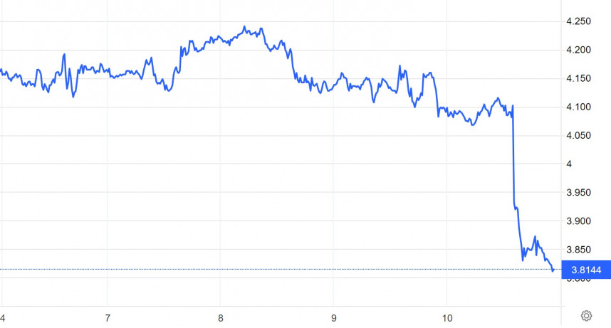Het eerste plaatje laat het effectieve rendement op tienjarige Amerikaanse staatsleningen, zeg maar de Amerikaanse kapitaalmarktrente, zien over de laatste vijf dagen. Na de publicatie van de inflatiecijfers op donderdagmiddag daalde deze rente in korte tijd van 4,1% naar 3,8%. Dat is echt een enorme beweging.
