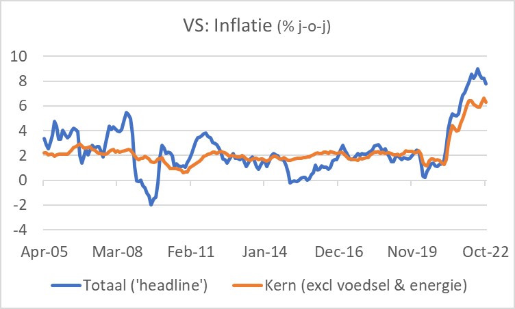 Hoe dan ook, de Amerikaanse inflatie daalde van 8,2% in september naar 7,7% in oktober. Ook de kerninflatie daalde iets, al laat de grafiek zien dat je daarvan nog niet kunt zeggen dat al een duidelijke daling is ingezet.