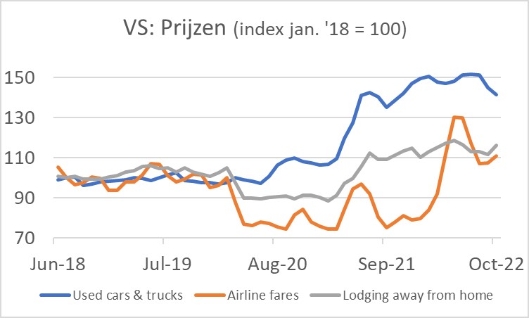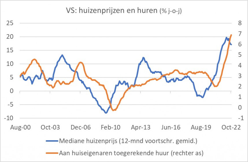 Al vaker heb ik geschreven over het belang van huren in de Amerikaanse inflatie. Het verhaal is simpel. Werkelijke woninghuren en aan huiseigenaren toegerekende huren maken zo'n 32% van de Amerikaanse inflatiemand uit (bij ons circa 22%). En in de mand van de kerninflatie zelfs zo'n 40%. Huren volgen in de VS de huizenprijzen, zij het met een vertraging, die varieert. In oktober is het stijgingstempo van de huren verder toegenomen: van 6,7% in september naar 6,9%. De volgende grafiek laat zien dat het stijgingstempo van de huizenprijzen inmiddels daalt. Met enige vertraging gaat dan ook de stijging van de huren zakken. Maar dat zal pas in de loop van 2023 vorm krijgen. Wanneer dat gebeurt, zal het snel gaan met de daling van de inflatie in de VS.