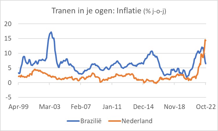 Ook de Nederlandse inflatie is in oktober wat gedaald. Volgens de nationale maatstaf van 14,5% in september tot 14,3% in oktober. Volgens de Europese HICP-maatstaf is de inflatie bij ons gedaald van 17,1% in september naar 16,8% in oktober, dat werd vorige week al gepubliceerd. Ondanks de daling krijg ik er steeds weer de tranen van in mijn ogen. De vergelijking gaat ongetwijfeld mank, maar in Brazilië is de inflatie inmiddels al maanden aan het dalen. Na een piek van 12,1% in april kwam de inflatie er in oktober uit op 6,5%, minder dan de helft van die bij ons! Onvoorstelbaar! En dat terwijl je Brazilië toch altijd associeert met veel hogere inflatie dan bij ons.