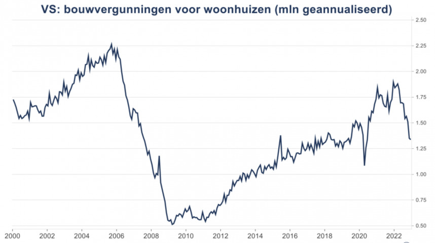 Er kan nog wel het één en ander misgaan waardoor de economie toch nog in een recessie belandt. De Fed gaat komende week de officiële rente ongetwijfeld verder verhogen, zeer waarschijnlijk met 0,25%. Het zou niet voor het eerst zijn dat de Fed te ver door gaat met renteverhogingen en dan een recessie veroorzaakt. De rentegevoelige sectoren hebben al behoorlijke klappen opgelopen. Dat betreft vooral de bouw en de huizenmarkt. Voorlopig is daar nog geen kentering in zicht. Het aantal afgegeven bouwvergunningen voor bijvoorbeeld woningen blijft afnemen. Daarbij zij opgemerkt dat de kapitaalmarktrente al een poosje daalt en de hypotheekrente (30 jaar vast) is sinds de piek in oktober/november bijna een vol procentpunt gedaald. De Amerikaanse huizenmarkt en bouwsector reageren doorgaans snel en sterk op schommelingen in de rente. Het kan dus zijn dat de kapitaalmarkt een mogelijke 'fout' van de Fed corrigeert. We gaan het zien.