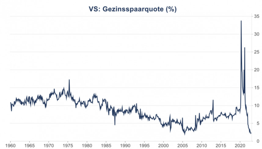Een andere opvallende ontwikkeling in de Amerikaanse economie is dat gezinnen uit hun lopende inkomen duidelijk minder sparen dan voor de pandemie. Toegegeven, tijdens de pandemie konden ze minder uitgeven dan normaal en zo zijn er forse spaartegoeden opgebouwd, net als bij ons. Dat de particuliere consumptie ondanks de hoge inflatie in volume toch enigszins kan groeien, is te danken aan die lage spaarquote. Hoe houdbaar die lage spaarquote is, valt niet te voorspellen. Dit hebben we nog niet eerder meegemaakt. Wie het weet, mag het zeggen. Het is denkbaar dat de spaarquote stijgt en dat daardoor de consumptiegroei afzwakt. Maar het is ook mogelijk dat de inflatie verder terugvalt, de reële inkomensgroei daardoor wordt versterkt en de spaarquote laag blijft. Dit kan de consumptiegroei dan juist aantrekken.