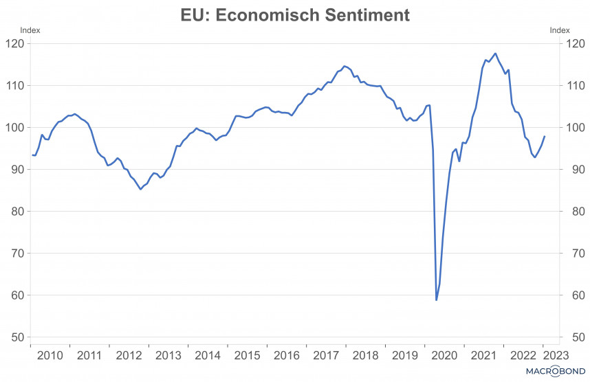 De Europese Commissie publiceert maandelijks een veel bredere vertrouwensindex, Economic Sentiment. Die steeg voor de eurozone in januari voor de derde maand op rij: van 97,1 in december naar 99,9.