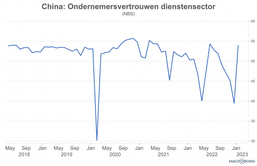 De heropening van de Chinese samenleving en daarmee van de Chinese economie is een tweede cruciale, positieve factor. China is al decennia de groeimotor van de wereld. Die viel stil in het laatste deel van vorig jaar. Je zag dat niet alleen in de Chinese cijfers, maar ook in de economische cijfers van de landen in de regio en bijvoorbeeld in de handelsstroom tussen China en de VS. Het kan niet anders dan dat de Chinese economie uit de startblokken gaat schieten nu de festiviteiten rond Chinees Nieuwjaar worden of zijn afgesloten. Een eerste teken daarvan bleek in de cijfers over het ondernemersvertrouwen in januari. Volgens de NBS steeg de index van het vertrouwen in de dienstensector van 41,6 in december tot 54,4 in januari. Dat laatste cijfer is zeker geen record, maar de stijging ten opzichte van de voorafgaande maand was de op één na grootste in de historie van deze reeks.