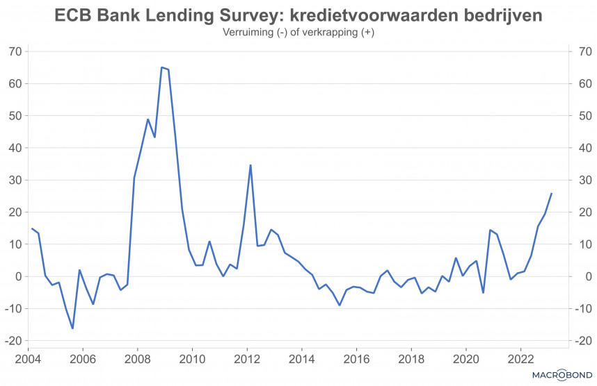 Het is niet alleen rozengeur en maneschijn. Het ondernemersvertrouwen in Europa mag dan wel verbeteren, de zogeheten Bank Lending Survey van de ECB schets een minder fraai beeld. De ECB ondervraagt de banken eens per kwartaal over kredietvoorwaarden, de vraag naar krediet etc. In de meest recente versie van deze enquête zeggen banken dat ze hun kredietvoorwaarden fors hebben verkrapt in het laatste deel van 2022. Hoe hoger de lijn in de volgende grafiek, des te meer banken per saldo de kredietvoorwaarden voor bedrijven hebben verkrapt. Het niveau in het vierde kwartaal vorig jaar is natuurlijk nog lang niet wat het in 2008/2009 was en het is ook niet zo erg als tijdens de eurocrisis in 2012, maar toch…