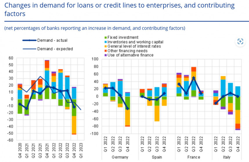 In dezelfde enquête rapporteren banken ook een opmerkelijk forse daling van de vraag naar krediet door bedrijven. Dat is ook niet echt een heel geruststellend idee. Vooral de vraag naar krediet voor investeringen neemt snel af, terwijl de kredietvraag uit hoofde van de behoefte aan werkkapitaal nog steeds behoorlijk stijgt. Geen fijne combinatie!