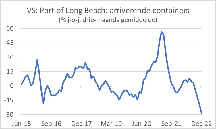 Een andere tegenstelling is te vinden in het ondernemersvertrouwen in diverse regio's. Terwijl dat vertrouwen in Europa en China verbetert, loopt het in de VS juist terug. Tja, de Amerikanen hadden minder last van de hogere gasprijzen dan wij en profiteren dus minder van de daling ook al daalt de gasprijs in de VS ook stevig. En van de heropening van China gaan de Amerikanen vooral de gevolgen ondervinden in toenemende import. Het volgende plaatje laat zien hoe het stilvallen van de Chinese economie erin heeft gehakt bij de Amerikaanse import. De daling van het aantal arriverende containers in de haven van Long Beach heeft de laatste maanden de daling van het begin van de pandemie in ruime mate overtroffen. Geen wonder dat het huren van containers voor de route van China naar de Amerikaanse westkust nu spotgoedkoop is.