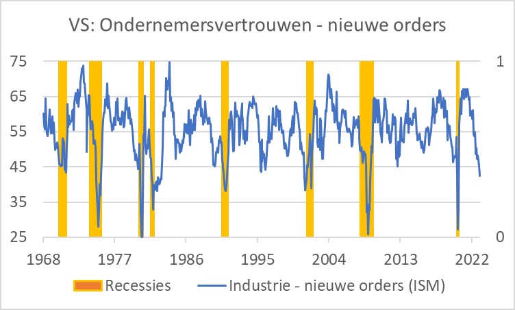 Ook sommige andere signalen stemmen niet bepaald vrolijk. De Amerikaanse yield curve is al maanden 'omgekeerd'. Het effectieve rendement op tienjarige staatsleningen is al tijden lager dan het effectieve rendement op tweejarige leningen, of dan de geldmarktrente of de Fed Funds rate. In het verleden was een omgekeerde yield curve een betrouwbare voorspeller van recessies. Het vertrouwen van ondernemers in de Amerikaanse industrie is in januari opnieuw gedaald. De belangrijke ISM-index kwam uit op 47,4 in januari, tegen 48,4 in december. Hoewel er wat ups en downs zijn geweest, daalt deze vertrouwensindicator eigenlijk al ruim een jaar. Economen kijken graag naar de 'nieuwe orders' component. Die kwam in januari uit op 42,5. In december was die nog 45,1. De volgende grafiek laat zien dat het niveau van januari in het verleden doorgaans, doch niet altijd, samenviel met, dan wel werd gevolgd door een recessie.