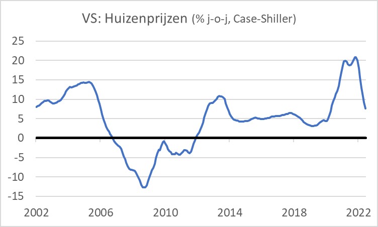 Een andere zwakke sector in de Amerikaanse economie betreft de huizenmarkt. De gestegen hypotheekrente doet zich voelen. De prijzen van huizen zijn vanaf juli vorig jaar elke maand gedaald ten opzichte van de maand ervoor. De jaar-op-jaar stijging is daardoor behoorlijk tanend.