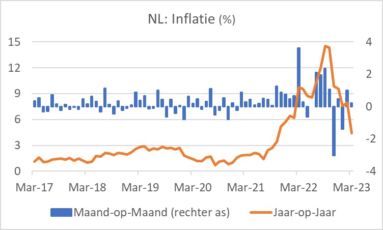 De inflatie in ons land is maart fors gedaald. Dat kwam vooral door energie. Bemoedigend was dat het tempo van prijsstijgingen buiten energie niet meer versnelde. De vooruitzichten zijn een tikkeltje verwarrend. Lagere energieprijzen, de vertraagde doorwerking van energieprijzen elders in de economie en basiseffecten zullen het jaar-op-jaar inflatiecijfer in het najaar waarschijnlijk onder nul drukken. Maar dat zal tijdelijk zijn. De inflatie zal dan weer terugveren vanwege de combinatie van loon-prijsspiraal en winst-prijsspiraal.