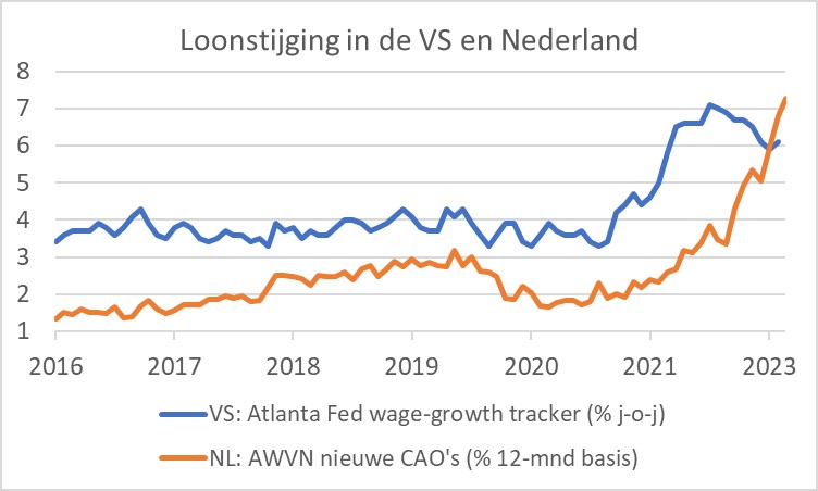 Het volgende plaatje brengt mooi in beeld dat de loonstijging in ons land volgens de AWVN-reeks inmiddels uitsteekt boven die in de VS. Voor mij is dat reden te denken dat ons inflatieprobleem, na een kortstondige dip in het najaar uiteindelijk wel eens hardnekkiger kan zijn dan in de VS.