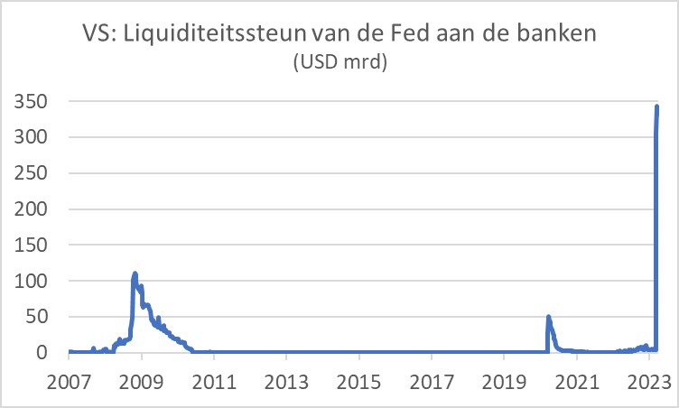 Een belangrijk verschil met 2008 is hoe snel banken hun deposito's kunnen verliezen. Met een paar muisklikken is het geld vertrokken. SVB verloor op één dag naar verluidt $42 miljard, circa 20% van het balanstotaal. Dat zette rekeninghouders bij andere kleinere banken ertoe aan om hun geld naar veiliger geachte banken over te hevelen. De Fed heeft daarop zeer alert gereageerd. Zoals in de volgende grafiek is te zien, is de totale hoeveelheid liquiditeitssteun die momenteel uitstaat veel groter dan in de crisis van 2008 en de pandemie. Sommige commentatoren oordelen daar negatief over. Ik zou er niet al te stevige conclusies aan willen verbinden. Eigenlijk vind ik het positief. Het huidige probleem betreft eerder een liquiditeitsprobleem dan een solvabiliteitsprobleem. De Fed heeft goede instrumenten om liquiditeitsproblemen het hoofd te bieden.