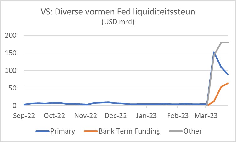 De volgende grafiek laat de belangrijkste drie verschillende vormen van liquiditeitssteun zien. Onder het Bank Term Funding Program kunnen banken hiervoor gekwalificeerd papier als onderpand gebruiken tegen de nominale waarde, niet de marktwaarde. Deze faciliteit is pas in het leven geroepen na het omvallen van SVB. Er wordt stevig op getrokken doordat het papier dat banken als onderpand gebruiken door de rentestijging in waarde is gedaald. Onder deze nieuwe faciliteit is dat geen probleem. Voor de Fed levert het geen noemenswaardig risico op. Want de betreffende tegenpartij neemt het papier ook weer tegen de nominale waarde terug of de Amerikaanse overheid lost het af tegen de nominale waarde. Onder 'other' vallen kredieten die via de FDIC lopen; dat is ook nieuw. Wat opvalt, is dat het totale bedrag aan uitstaande liquiditeitssteun in de afgelopen week is gedaald, maar dat de bedragen onder de twee nieuwe faciliteiten zijn gestegen. Ik concludeer daaruit dat de problemen bij de banken zich beperken tot bijzondere gevallen.