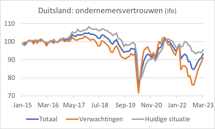 Duitse ondernemers zijn volgens de Ifo-index in maart optimistischer geworden. Vooral de verwachtingencomponent steeg meer dan verwacht. Vorige week bleken economen volgens de ZEW-index juist pessimistischer over de Duitse economie te zijn geworden. Volgens mij kwam dat laatste vooral door de onrust in de financiële sector en is het wellicht een blijk van enige beroepsdeformatie. Ondernemers staan met hun 'poten in de klei'. Zij zien de fors gedaalde energieprijzen en putten daar ongetwijfeld hoop uit.