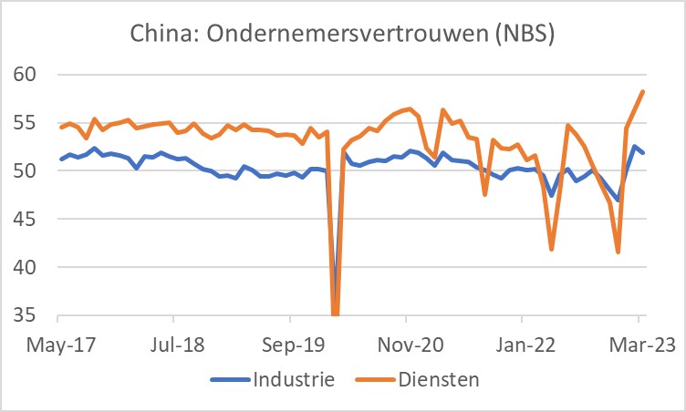 De Chinese economie lijkt zich momenteel te kenmerken door een tegenstelling tussen de industrie en de dienstensector. Na het einde van het zerocovidbeleid in december was de verwachting dat de bedrijvigheid sterk zou opleven. Dat lijkt in de dienstensector ook te gebeuren. Het ondernemersvertrouwen steeg van een al hoge 56,3 in februari naar 58,2, de hoogste stand sinds 2011. Relatief warm weer en maatregelen van lokale overheden om de consumptie aan te moedigen hadden naar verluidt een positieve invloed. Anders gesteld is het in de industrie. Daar lag de vertrouwensindex van de NBS weliswaar ook boven de 50, wat duidt op groei in de sector, maar de index daalde van 52,6 in februari naar 51,9 in maart. De komende maanden zal wel duidelijk worden of het hier om tijdelijke opstartproblemen gaat of dat er een meer fundamenteel probleem is.