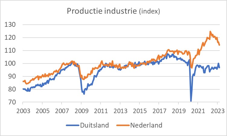 Het gaat niet lekker met onze industrie en ook niet met die in Duitsland. De productie in de verwerkende industrie in ons land is in maart met 2,0% gedaald ten opzichte van februari en met 4,0% ten opzichte van maart 2022. Het was de derde maand op rij met een daling ten opzichte van een jaar eerder. In de chemie en de rubber- en kunststofindustrie nam de productie wel iets toe ten opzichte van februari. Dat mag je ook verwachten in deze energie-intensieve sectoren nu de energieprijzen fors zijn gedaald. Toch lag het productieniveau in de chemie nog wel 17,6% (!) lager dan een jaar eerder en in de rubber- en kunststofindustrie 9,5%.