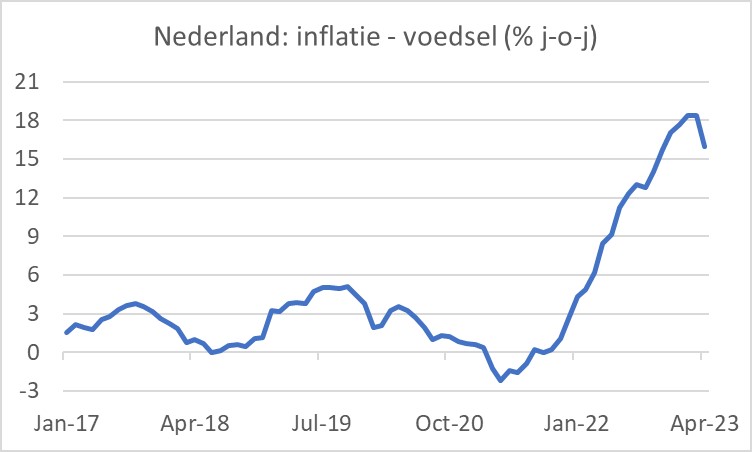 Vorige week had het CBS al de 'snelle raming' van de inflatie over april gepubliceerd. Die is opgelopen van 4,4% jaar-op-jaar in maart tot 5,2% in april. Deze week volgden de definitieve cijfers en alle details. Het goede nieuws is dat het stijgingstempo van de voedselprijzen eindelijk wat afnam. Deze kwam uit op 15,9% jaar-op-jaar tegen 18,4% in februari en maart. De matiging van de voedselinflatie is ongetwijfeld het vertraagde gevolg van de daling van de energieprijzen. Ik verwacht een verdere daling van de voedselprijsinflatie.