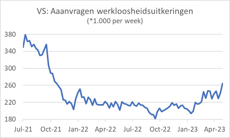 Lagere inflatiecijfers zullen de Fed waarschijnlijk doen besluiten de rente bij hun beleidsvergadering in juni ongemoeid te laten, na tien opeenvolgende verhogingen. Ook diverse conjunctuurindicatoren kunnen ertoe bijdragen dat de Fed zal besluiten de rente niet verder te verhogen. Er is immers sprake van een best wel duidelijke conjuncturele verzwakking. Zo is het aantal aanvragen voor werkloosheidsuitkeringen in de meest recente week opgelopen tot 264.000. Zo'n cijfer was al zo'n anderhalf jaar niet gezien.