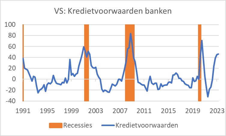 Net als in de eurozone scherpen Amerikaanse banken hun kredietvoorwaarden aan. Dit kan uitmonden in kredietschaarste wat een behoorlijke domper op de conjunctuur zal zetten. Het volgende plaatje is gebaseerd op de enquête die de Fed elk kwartaal uitvoert onder de banken. Een waarneming boven nul betekent dat meer banken zeggen de kredietvoorwaarden aan te scherpen dan er banken zijn die de kredietvoorwaarden versoepelen. Het huidige niveau van deze reeks viel in het verleden steevast samen met een recessie.