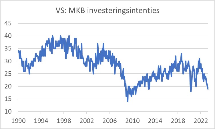 Alsof striktere kredietvoorwaarden bij banken nog niet genoeg zijn, nemen de investeringsplannen van ondernemingen ook af. De volgende grafiek toont de investeringsintenties van mkb-bedrijven. Die dalen al sinds oktober 2021. Evenmin een goed teken voor de conjuncturele vooruitzichten.
