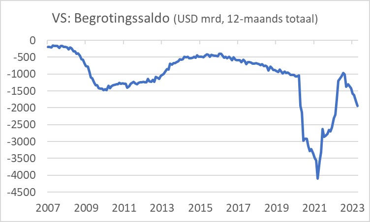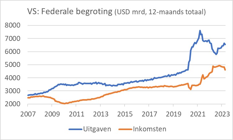 Het moment waarop de Amerikaanse overheid niet meer aan alle betalingsverplichtingen kan voldoen, komt rap naderbij. Wellicht dat een tijdelijke oplossing wordt gevonden waarmee een paar maanden uitstel van executie kan worden gevonden. Maar het is duidelijk een heel moeizaam proces waarbij Democraten en Republikeinen elkaar geen millimeter ruimte gunnen en hopen dat de andere partij electorale averij oploopt als het eindigt in chaos. De Democraten willen hun overigens al aangenomen begroting uitvoeren, maar de Republikeinen eisen bezuinigingen. Anders zijn ze niet bereid het schuldenplafond te verhogen. Het is een soort chantage, die overigens wel vaker voorkomt in de Amerikaanse politiek. Er tekent zich trouwens een opmerkelijke ontwikkeling af bij de overheidsfinanciën in de VS. Het federale tekort is sinds medio vorig jaar in rap tempo toegenomen zoals de volgende grafiek laat zien. Het tekort beloopt inmiddels circa 7,5% bbp. Dat liegt er niet om.