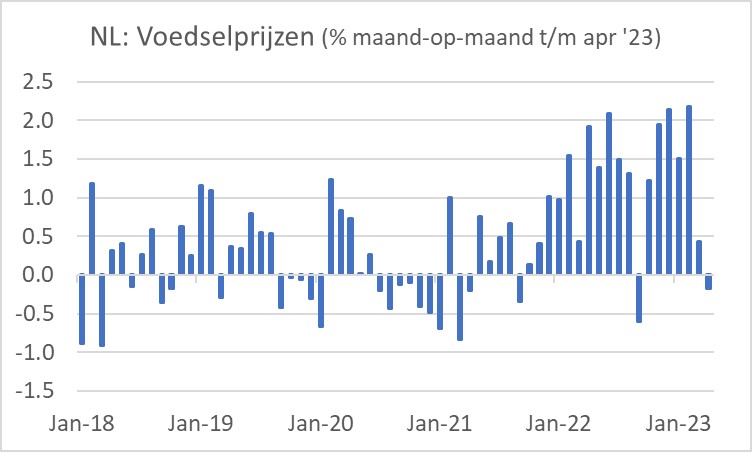 Volgens de definitieve inflatiecijfers over april neemt de stijging van voedselprijzen bij ons eindelijk iets af. De eerste grafiek laat zien dat voedselprijzen in ons land in april zelfs iets zijn gedaald ten opzichte van maart. Dat was slechts 0,2% dus je moest wel een vergrootglas gebruiken om het te zien. Maar toch.