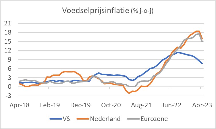 De voedselprijsinflatie daalt eindelijk. In ons eigen land zijn de voedselprijzen in april zelfs iets gedaald, al zal dat niet direct tot euforie leiden. Gelet op de ontwikkeling van de Europese gasprijzen en de wereldmarktprijzen voor agrarische grondstoffen ligt een verdere en forse verdere daling van de voedselprijsinflatie de komende maanden in het verschiet.