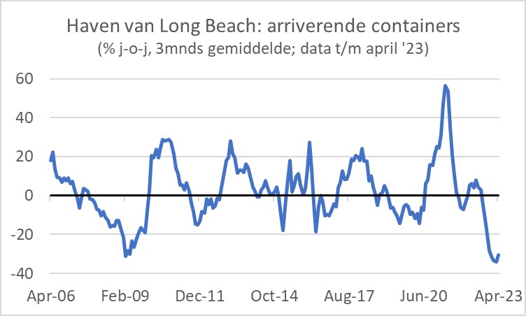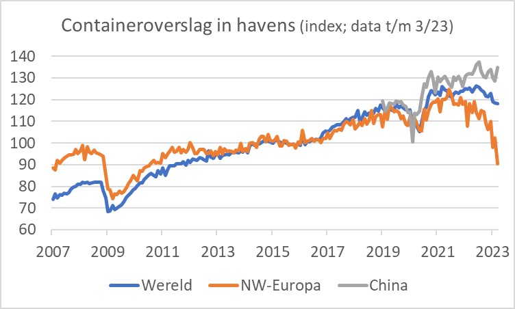 De containeroverslag in zeehavens in ons deel van de wereld (Rotterdam, Antwerpen, Hamburg, Bremerhaven, Zeebrugge en Le Havre) lag in maart zo'n 30% lager dan op het hoogtepunt in 2021. In het eerste kwartaal dit jaar lag de containeroverslag meer dan 15% lager dan in het eerste kwartaal van 2022. De voortgaande, en zelfs versnellende daling van de laatste maanden is opmerkelijk.