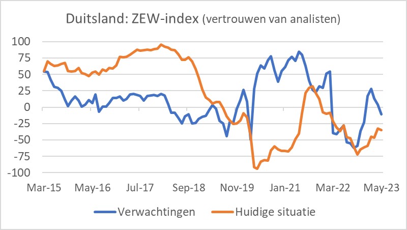 In Duitsland is het vertrouwen van economen en analisten over de stand en vooruitzichten voor de economie in mei verslechterd. De verwachtingscomponent van de ZEW-index daalde voor de derde maand op rij en noteerde -10,7. Het langetermijngemiddelde van deze reeks ligt rond +21.