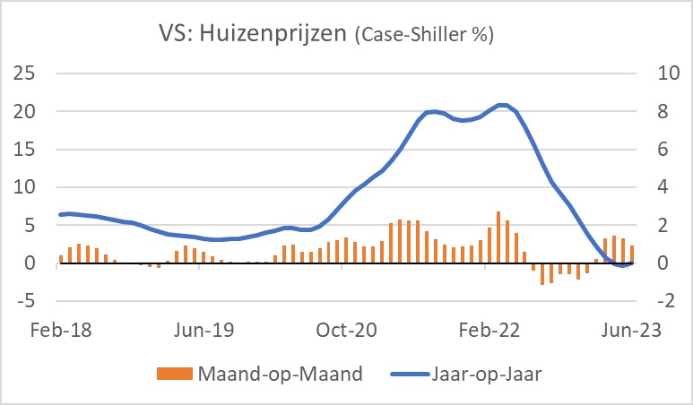 De macro-economische cijfers uit de VS schetsen een verwarrend beeld. De economische groei in het lopende kwartaal is aanzienlijk hoger dan in de voorafgaande kwartalen. Toch ontspant de arbeidsmarkt. De huizenprijzen stijgen de laatste maanden weer. Mij bekruipt het verontrustende idee dat die stijgende huizenprijzen impliceren dat de rente nog verder omhoog zal moeten.