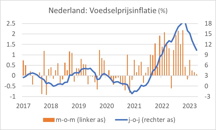 Iedereen moet eten, dus wordt er veel gekeken naar voedselprijzen. De voedselprijzen volgen de wereldmarktprijzen en de energieprijzen, zij het met aanzienlijke vertragingen. Het volgende plaatje laat zien dat de voedselprijsinflatie inmiddels behoorlijk is gedaald, maar dat de prijzen tot nu toe in nagenoeg elke maand wel zijn gestegen. Die maandelijkse stijging is inmiddels gelukkig wel gering en ik verwacht dat voedselprijzen binnen afzienbare tijd ook werkelijk iets zullen dalen. Bij sommige producten is dat al gaande. Zo daalt de melkprijs al enkele maanden.