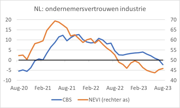 Wanneer bedrijven interen op voorraden produceren ze minder dan ze verkopen. Als alle bedrijven dat tegelijkertijd doen, ontstaat een neerwaartse spiraal. Je ziet dat terug in gegevens over het ondernemersvertrouwen en de inkoopmanagersindices. De index van het ondernemersvertrouwen van het CBS is gedaald van +0,1 in juli tot -2,2 in augustus, het laagste cijfer sinds november 2020. Dat spoort met de cijfers over de feitelijke productie die een forse krimp jaar-op-jaar laat zien. De index van de NEVI, die het oordeel van inkoopmanagers weergeeft, was in augustus voor de twaalfde maand op rij lager dan 50, wat voortgaande krimp in de industrie suggereert. Een lichtpuntje is wellicht dat de NEVI-index iets verbeterde: van 45,3 in juli tot 45,9 in augustus. Dat was de tweede achtereenvolgende maand waarin de index iets steeg. De details wekken de indruk dat het niet meer lang zal duren tot het proces van voorraadintering voltooid is.
