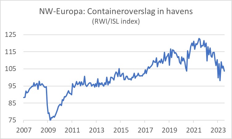 Vooralsnog zien we in de havens nog geen positieve ontwikkelingen. De containerindex van RWI/ISL, die de containeroverslag in de havens van Hamburg, Bremen/Bremerhaven, Rotterdam, Antwerpen, Zeebrugge en Le Havre meet, daalde in juli met 2,6% ten opzichte van juni en was daarmee 7,2% lager dan een jaar eerder.