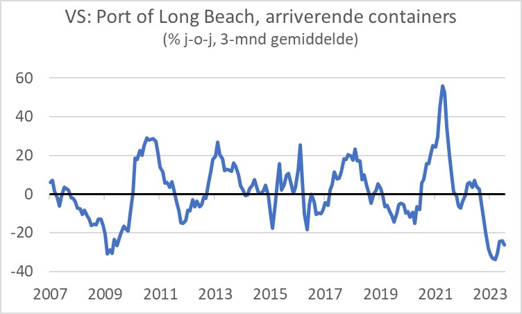 Het containervervoer op de Stille Oceaan groeit evenmin. Het volgende plaatje toont de ontwikkeling van het aantal containers dat arriveert in de haven van Long Beach, aan de Amerikaanse Westkust. Dat zit nog stevig in de min.