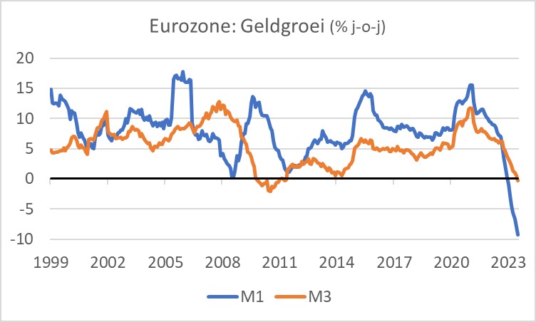 Ook de geldgroei in de eurozone daalt. Sterker nog, het zogeheten geldaggregaat M1 krimpt al enige tijd en niet zo zuinig ook. Zulke krimp hebben we sinds de introductie van de euro niet eerder gezien. M1 omvat het fysieke geld in onze portemonnee maar vooral het geld op direct opeisbare banktegoeden. In het verleden is de groei van M1 vaak een redelijk goede voorspeller gebleken voor de conjunctuur op korte termijn. Hopelijk is het dit keer anders.