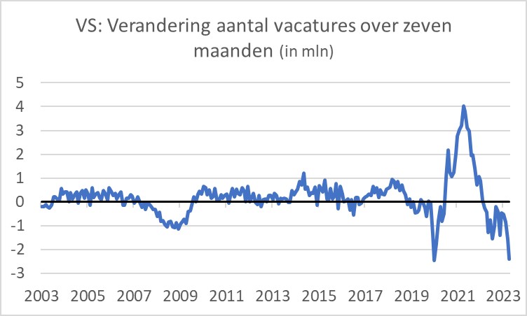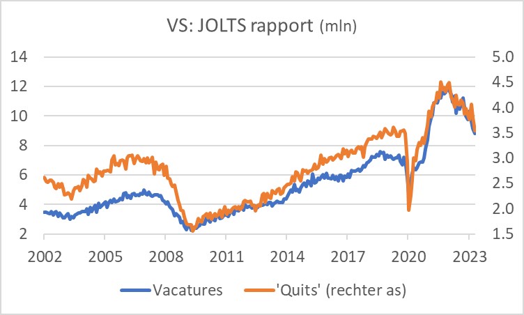 Desondanks lijkt de Amerikaanse arbeidsmarkt nu toch wel te ontspannen. Uit het zogeheten JOLTS-rapport (Job Openings and Labor Turnover Survey) blijkt dat het aantal vacatures momenteel in rap tempo daalt. In juli werden 8,8 miljoen vacatures geteld. In juni was dat nog 9,2 miljoen en in december 2022 11,2 miljoen. In juli waren er 5,8 miljoen werklozen. Ook het aantal mensen dat zelf ontslag neemt (de 'quits') daalt. Ik denk dat de cijfers mijn vermoeden bevestigen dat veel bedrijven vacatures hebben uitstaan die ze helemaal niet wensen te vullen, tenzij een goede kandidaat zich meldt. Je zou kunnen zeggen dat de krappe arbeidsmarkt tot een zekere 'inflatie' van het aantal vacatures heeft geleid. Dat zal ook de loonstijging drukken en is eigenlijk precies wat de Federal Reserve wil.