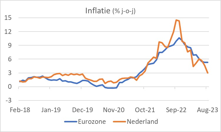In de eurozone als geheel bleef de inflatie in augustus onveranderd ten opzichte van juli: 5,3%. De kerninflatie daalde wel iets: van 5,5% in juli tot 5,3% in augustus. Daarmee blijft de kerninflatie toch oncomfortabel hoog en de ECB zal ongetwijfeld de rente nog wat verder verhogen.