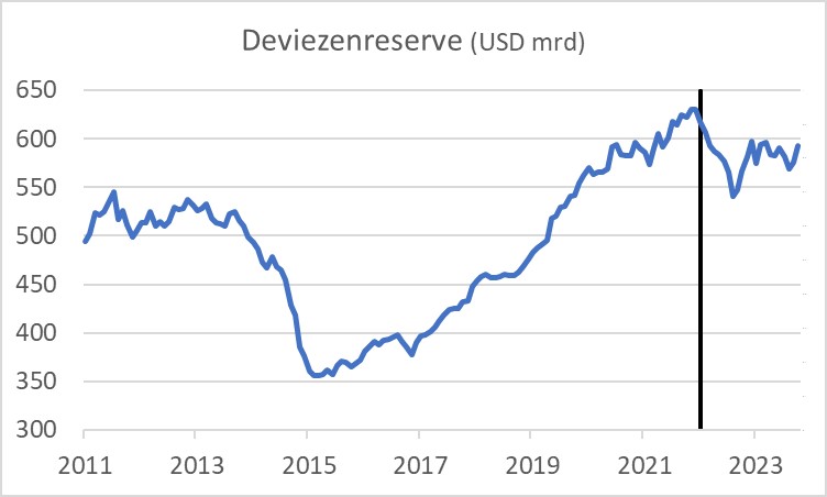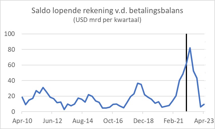 Rusland heeft al lange tijd een comfortabele positie op de lopende rekening van de betalingsbalans, met jaarlijkse overschotten. In 2022 liep dat overschot zelfs op tot circa 10% bbp. Dat kwam doordat – mede door onze handelsembargo's – de importwaarde aanzienlijk daalde terwijl de stijgende olieprijs de inkomsten liet groeien, ondanks dat Rusland zijn olie met korting moest verkopen aan landen als India en China. Dit jaar is het beeld omgedraaid. De importwaarde groeit en de exportwaarde daalt juist. Toch lijken zich geen acute betalingsbalansproblemen voor te doen.