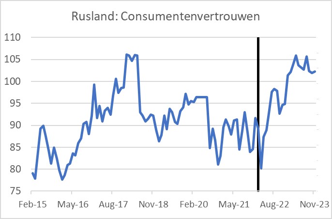 Het Russische consumentenvertrouwen kreeg een tik door het uitbreken van de oorlog (verticale lijn in de volgende grafieken), maar is sindsdien opmerkelijk hersteld. Zo te zien is de Russische consument behoorlijk in zijn sas.